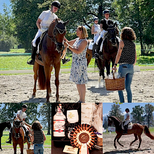 Bei sommerlichen Temperaturen ging es zu 13:20 Uhr ins Viereck: Spark of Life ertanzte sich eine WN 7,7 nach richterlicher Maßgabe bei Sommersgluthitze. Die beiden waren redlich fertig nach der super Leistung. Auch die anderen Starter gaben ihr Bestes – die Sonne war Zeuge, am Ende langte es jedoch bei keinem am Dancing-Fuchs vorbei – damit war den beiden fürs schweißtreibende Engagement die Goldmedaille in der Prüfung sicher. Platz1! Wir zollen Respekt für diesen enormen sportlichen Einsatz und gratulieren herzlichst.