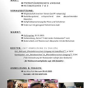 - Mitgliedschaft in einem Reitverein (für den Pferdeführerschein notwendig)