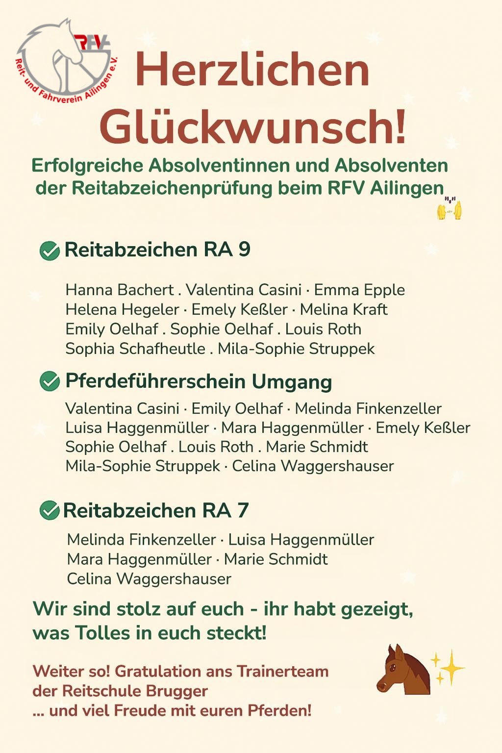 RFVA & Reitschule Brugger: Herzlichen Glückwunsch! Erfolgreiche Absolventen:innen der Reitabzeichenprüfungen ✅