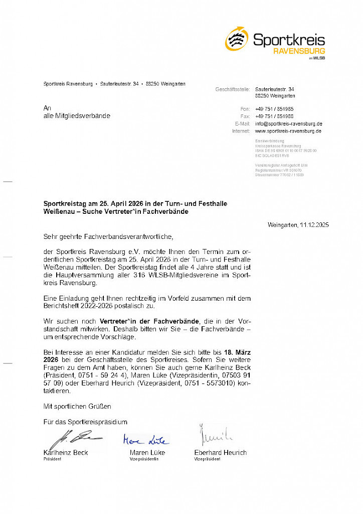 ✅ Einladung zum Sportkreistag am 25. April 2026 in Weißenau