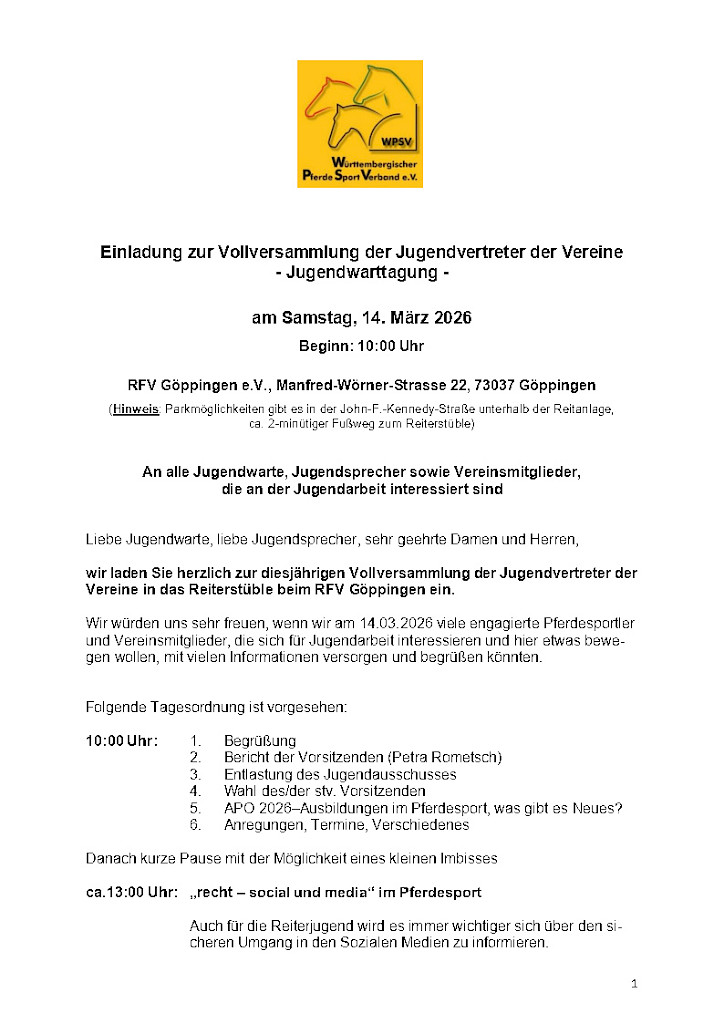 Einladung zur Jugendwarttagung am 14.03.26, Beginn 10:00 Uhr beim RFV Göppingen