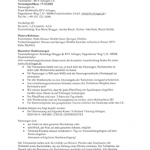 Der Veranstalter haftet nicht für Unfälle von Reitern, Pferden oder Zuschauern, für Diebstahl sowie Sachschäden, die aus Haltung eines Pferdes entstehen. Die Teilnahme, der Besuch oder die Benutzung der Einrichtungen geschieht auf eigene Gefahr. Alle Besitzer und Teilnehmer sind persönlich haftbar für Schäden gegenüber Dritten, die durch sie selbst, ihre Angestellten, ihre Beauftragten oder ihre Pferde verursacht werden.