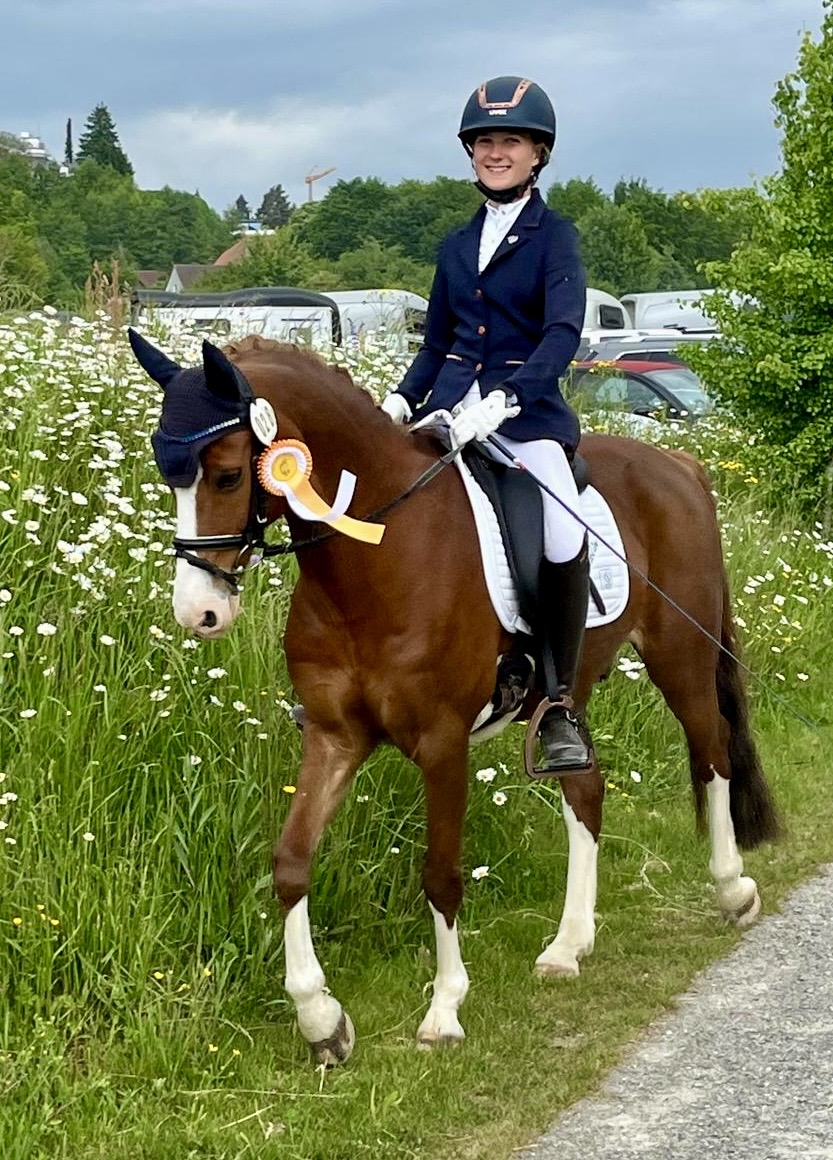 ... und am Samstag, den 17. Mai, ging es direkt um 12 Uhr in Wangen auf dem Dressurplatz weiter. Dorthin hatte unsere Clara Roggendorf ihren süßen Franklin mitgebracht, der ihr von Friederike Hack zur Verfügung gestellt wird. Die beiden starten in der Dressurprüfung der Klasse E und zeigten ihre Extraklasse. Die beiden tanzten sich durch die Aufgabenstellung ne posierten dann erfolgreich in der finalen Grußaufstellung - tolle Leistung! ...und so sahen es auch die Richter, vergaben hier die Wertnote von 7,8. Das war letztendlich Gold und unerreichbar für den Rest der ehrgeizigen Mannschaft. Wir gratulieren herzlichst zur ersten goldenen Schleife des tollen Wochenendes!