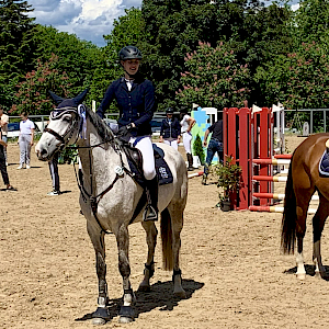 Sonntagmorgen in Weingarten wurde mit dem Reiterwettbewerb im Springen um 10 Uhr eingeläutet über eine Höhe von 55 cm. Mit am Start war unsere Lisa Saier,, die ihren Schimmelwallach Czartbitter gesattelt hatte und erfolgreich den etwas turbulenten, Abreiteplatz absolviert hatte. Die beiden gingen an eine erste Turnierrunde dieser Saison: der etwas anspruchsvolle Platz war eine Aufgabenstellung, die sie jedoch souverän meisterten. Wertnote 6,7 befanden die Richter. Am Ende für die beiden die erste Schleife 2024: wir gratulieren ganz herzlichst zu einem erfolgreichen 10. Platz. Weiter so!