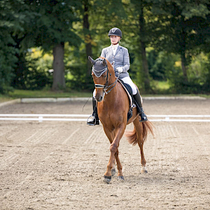 Bei sommerlichen Temperaturen ging es zu 13:20 Uhr ins Viereck: Spark of Life ertanzte sich eine WN 7,7 nach richterlicher Maßgabe bei Sommersgluthitze. Die beiden waren redlich fertig nach der super Leistung. Auch die anderen Starter gaben ihr Bestes – die Sonne war Zeuge, am Ende langte es jedoch bei keinem am Dancing-Fuchs vorbei – damit war den beiden fürs schweißtreibende Engagement die Goldmedaille in der Prüfung sicher. Platz1! Wir zollen Respekt für diesen enormen sportlichen Einsatz und gratulieren herzlichst.