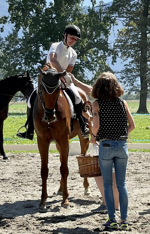 Bei sommerlichen Temperaturen ging es zu 13:20 Uhr ins Viereck: Spark of Life ertanzte sich eine WN 7,7 nach richterlicher Maßgabe bei Sommersgluthitze. Die beiden waren redlich fertig nach der super Leistung. Auch die anderen Starter gaben ihr Bestes – die Sonne war Zeuge, am Ende langte es jedoch bei keinem am Dancing-Fuchs vorbei – damit war den beiden fürs schweißtreibende Engagement die Goldmedaille in der Prüfung sicher. Platz1! Wir zollen Respekt für diesen enormen sportlichen Einsatz und gratulieren herzlichst.