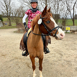 Zu 12:30 Uhr klingelte es für den Stilspring-Wettbewerb (ohne erlaubte Zeit) über 80 cm, und unsere Carla van Wees ließ es direkt krachen. Sie hatte ihre beiden Springstars aufgesattelt und mit Profi Lilly Belle ging's souverän mit Wertnote 8,5 auf Platz 2 und damit Silber. Youngster Carry Ass pilotierte sie ebenfalls erfolgreich durch den Parcours - Wertnote 8,2 und Platz 5. Teamkollegin Alina Häder hatte ihre Schimmelstute Lilli Rose aufgetrenst und sprang sensationell mit Wertnote 8,3 auf Platz 4. Und Teamamazone Laetitia Egger hatte ihren super sweeten Pass the Star aufgesattelt, mit Wertnote 7,7 kamen die beiden auf einen top Platz 10.