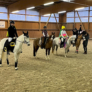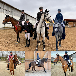 Es wird Sonntag, 16.3.2025, und in Ailingen startet früh morgens der Hänger-/Turnierpferdekonvoi Richtung Moosbeuren. Unsere Jugend hatte mit Trainerinnen Eva-Marie Brugger und Alisa Pickl fleissig trainiert und die Winterpause gut gemeistert - jetzt stand das erste Turnier auf der Agenda und los ging's! Schlechtes Wetter gibt's auch nicht - und so ließ sich auch niemand vom winterkalten Drizzelregen und Sturmböen-Draußen-Ambiente abhalten: gut angelandet wurde direkt gerichtet und warm geritten. Unsere jugendlichen Amazonen waren direkt erfolgreich und nahmen die Schleifen und Siegerehrungen gerne mit!