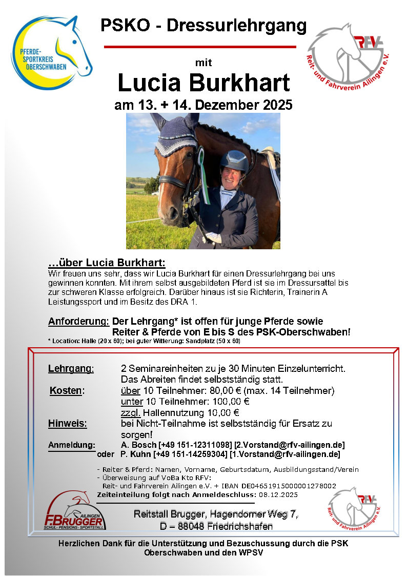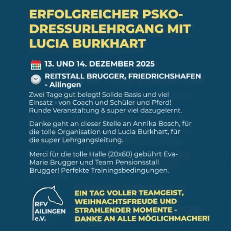 Am 13. und 14. Dezember 2025 fand im Reitstall Brugger, Hagendorner Weg 7, Friedrichshafen der PSKO-Dressurlehrgang mit der renommierten Dressurreiterin und Trainerin Lucia Burkhart statt. Zwei Tage voller intensiver Arbeit, wertvollem Input und großem Engagement – sowohl von Pferd als auch Reiter.