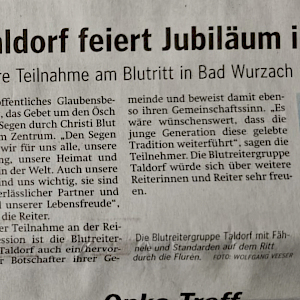 Mit der Teilnahme an der Reiterprozession ist die Blutreitergruppe Taldorf auch ein hervorragender Botschafter ihrer Gemeinde und beweist damit ebenso ihren Gemeinschaftssinn.