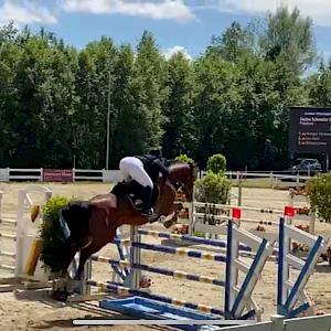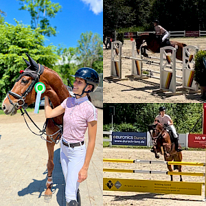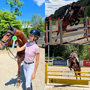 Jetzt wechseln wir kurz die Perspektive und fahren zusammen mit Lina Gaye am 15.6. nach Rielasingen: dort hatte Lina für ihre Feldrose die Springprüfung mit steigenden Anforderungen Klasse A** über 105 cm gebucht. Die beiden hatten erfolgreich das Warm-Up absolviert und starteten in der Prüfung durch! Feldrose gefiel die Umgebung unter der Parcours: einwandfreie Runde mit Null!-Fehlern in einer Zeit von 47,89s - sensationell gut - und in einem sehr ambitionierten Starterfeld katapultierte sie dieses Ergebnis direkt auf dem 5. Platz. Wir gratulieren, herzlichst!