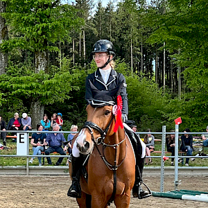 Es gibt kein schlechtes Wetter für echte Springreiter und damit startete Amazone Eva-Marie Brugger den Schleifenregen des Wochenendes mit ihren wilden Jungen am Freitag den 5.5. in Bad Schussenried. Passend zum Kreismeisterschaftsfeeling des PSK Biberach ging’s ambitioniert in der 1. Abteilung der Springpferdeprüfung Kl. A* mit ihrer beautiful Clarice Cooper an den start. Jump & fly war das Motto und die beiden segelten elegant mit Wertnote 8,1 auf Platz 4. Congratulations!