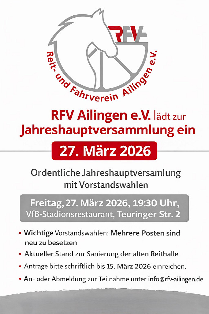 Kurzer Hinweis zur Jugendversammlung (Jugend-HV) des RFV Ailingen mit Jugendvorstandswahlen im 1. Quartal 2026 Termin:Freitag, 20. März 2026, ab 19:00 Uhr Ort: Stüberl über dem Spindraum, zur Gast auf der Reitanlage der Familie Brugger